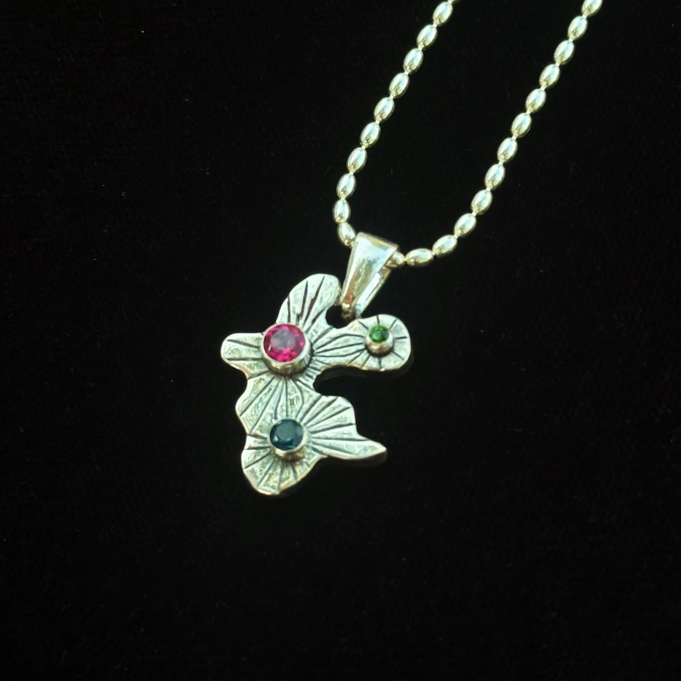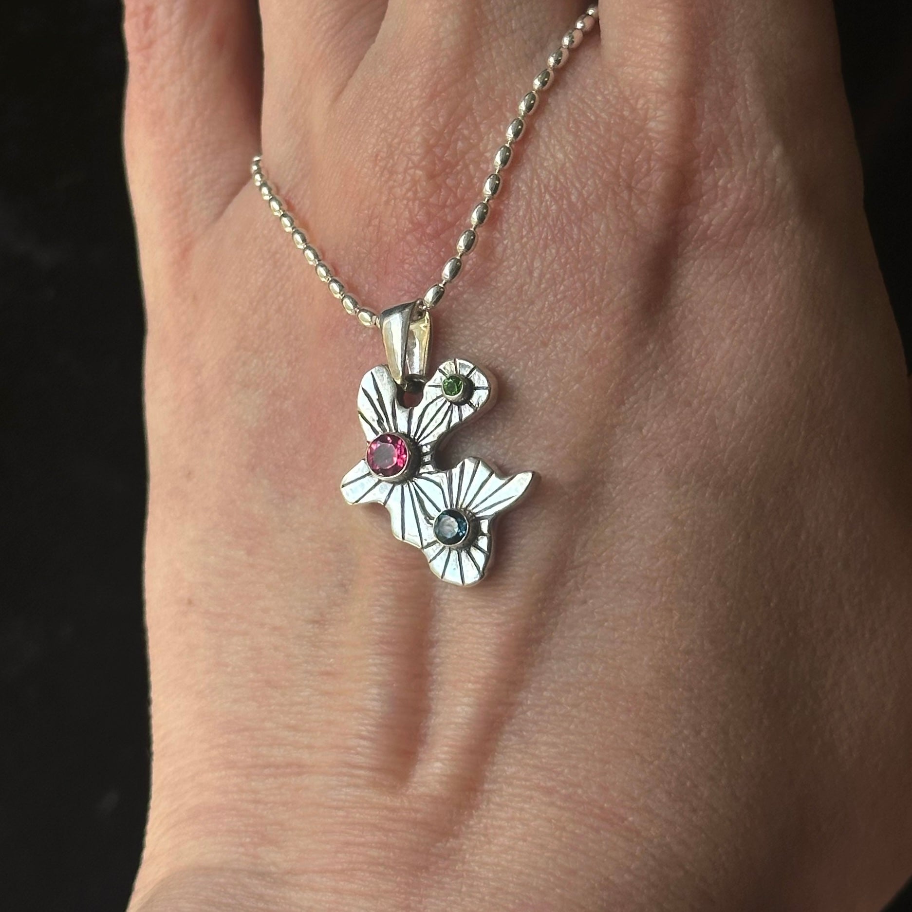 One of a kind hand carved and engraved amoeba pendant in sterling silver featuring Green Chrome Diopside, London Blue Topaz, and Pink Topaz on a 18” oval bead chain with a lobster closure and a 2” chain extender.