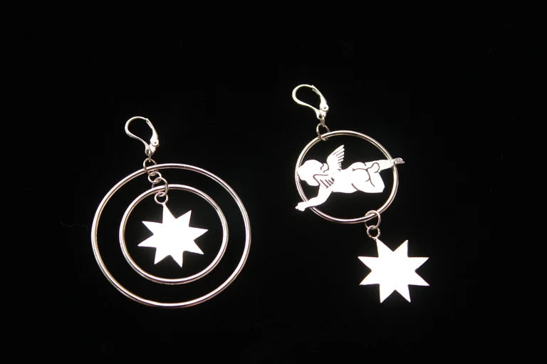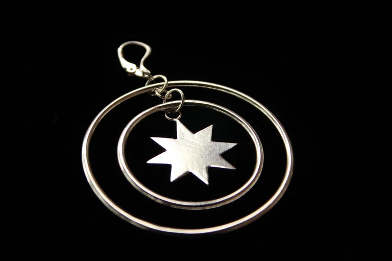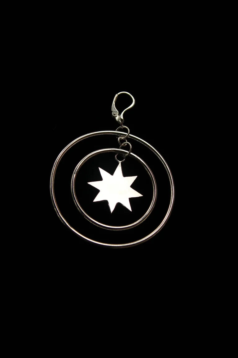Orbiting hoops surrounding a hand cut octagram on a lever back earring. Sold individually. You have the option to mix and match this style with the Astraeus earring or double up for two of a kind.