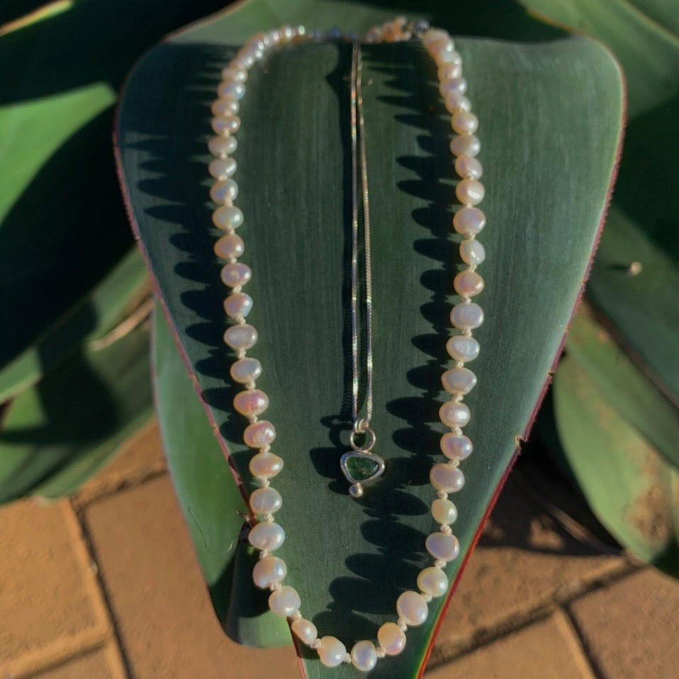 Description: A set of hand knotted fresh water pearls on silk + Green tourmaline set in 925 sterling silver