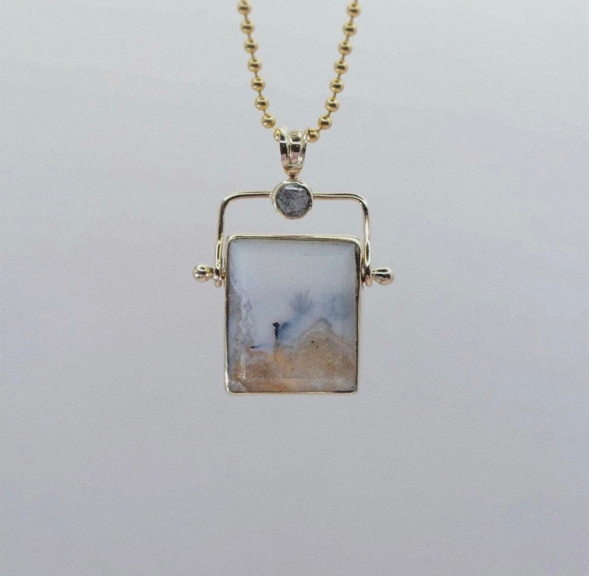 Description: Dendritic opal, rosecut salt and pepper diamond charm set in hand fabricated 10k yellow gold moveable hinge. Measures 20mm x 27mm with 4mm bail.