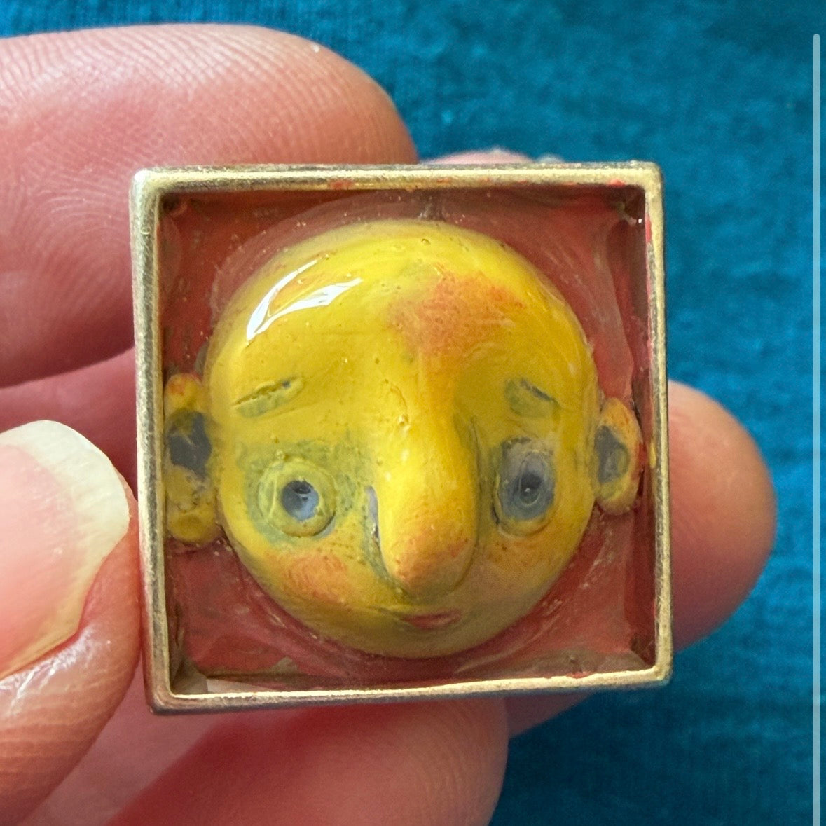 Description: Sculptural Illustration Face Ring. Polymer and resin, in metal base. 20mm square, adjustable band ($65.00)