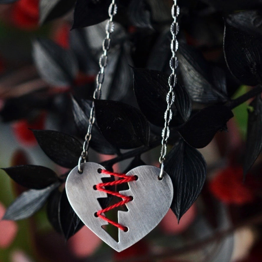Description: Sterling silver and thread mended broken heart. The chain length is 20”.