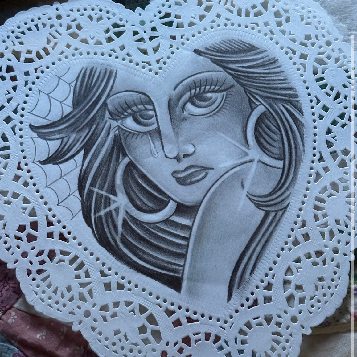 Description: 10in paper doily original graphite artwork in 8x10 floating frame