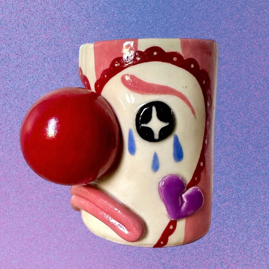 Description: sad valentine clown mug. wheel thrown, holds 16-20fl oz ($100)