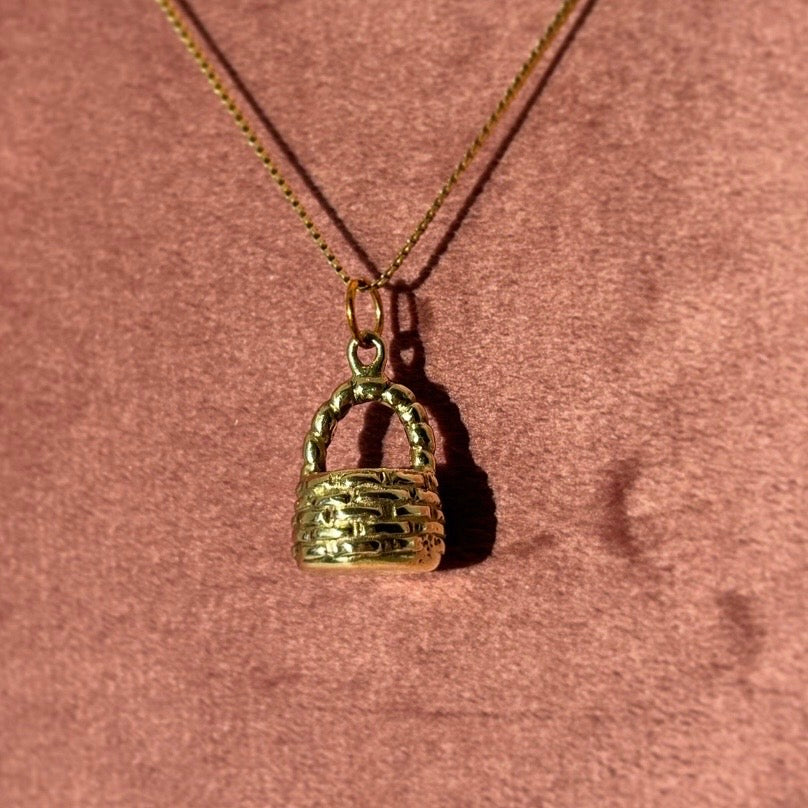 Description: Handmade yellow bronze Fruit Basket charm. This charm represents community and filling each others’ baskets. The charm is sent with a gold filled bail, chain is not included.