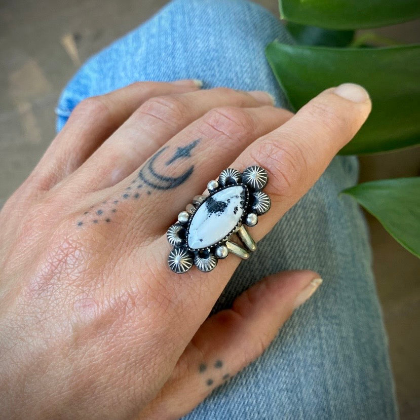 Description: Sterling silver and White Buffalo celestial ring. Handmade by us and finished in the buyer's preferred ring size. ($299)