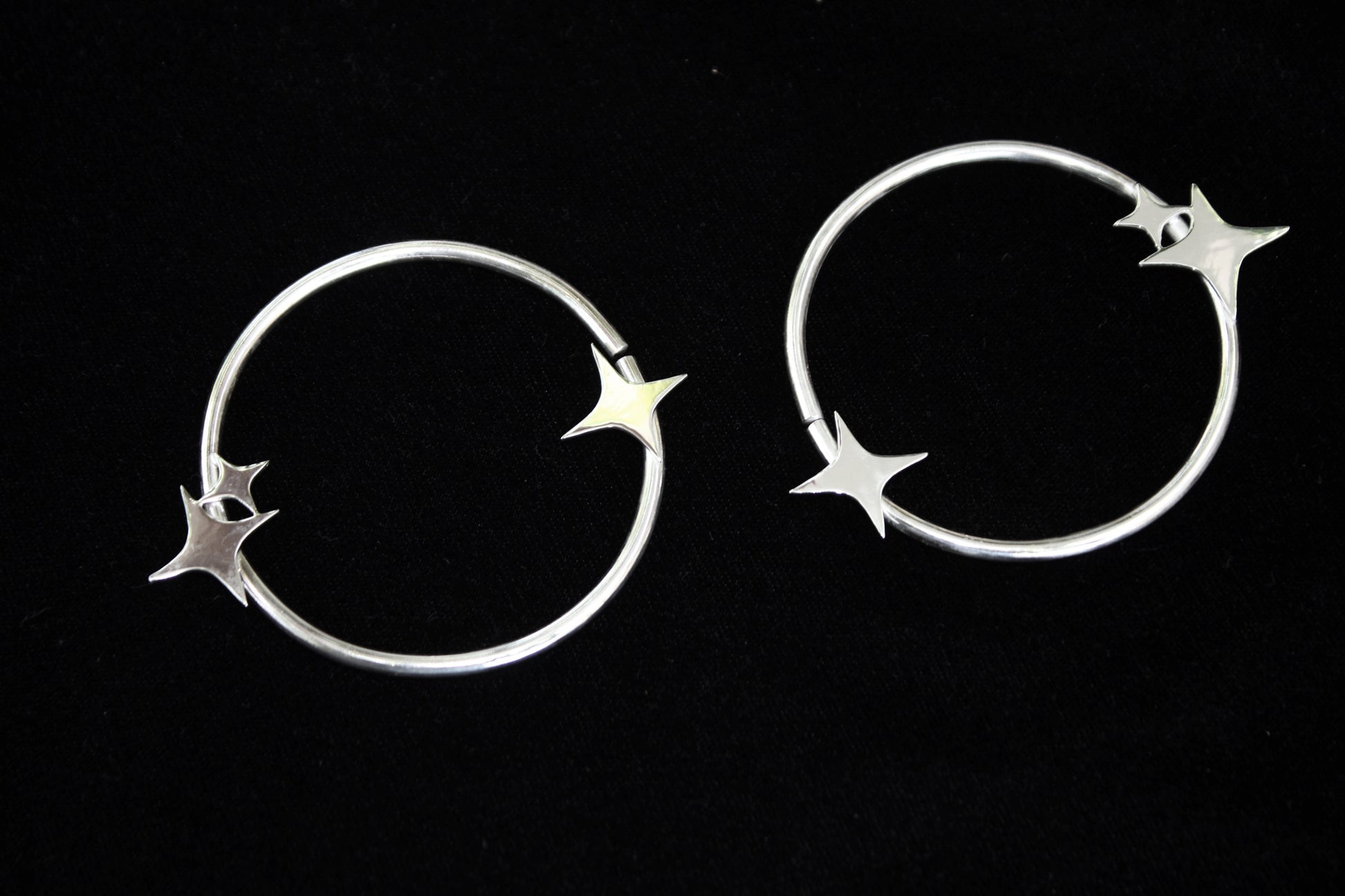 Made specifically for stretched earlobes, this larger iteration of the Scintillait hoops measure approximately 2.5” across and feature hand cut sparkle accents. Made with 8 gauge sterling silver, but can be made smaller with a note at checkout. Each earring weighs approximately .80 oz.